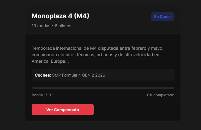 Cada fecha se encuentra separada y ordenada desde la 1° hasta la última, donde podés ver de forma individual los requisitos de mods, fechas de prácticas y más información de cada carrera.